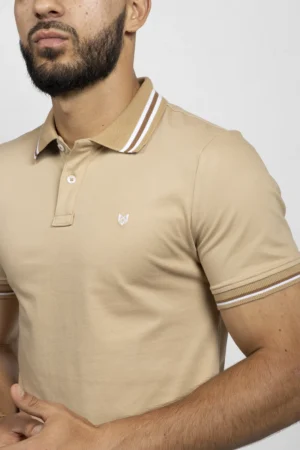 Manga corta, cuello y puños tejidos con rayas en contraste, perilla corta de botones y aberturas en los costados.
