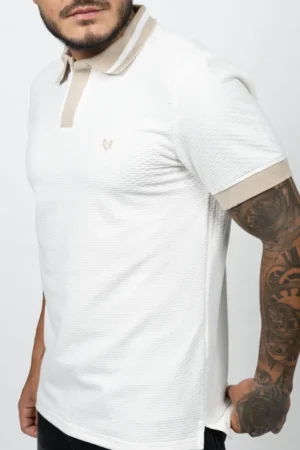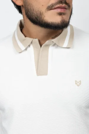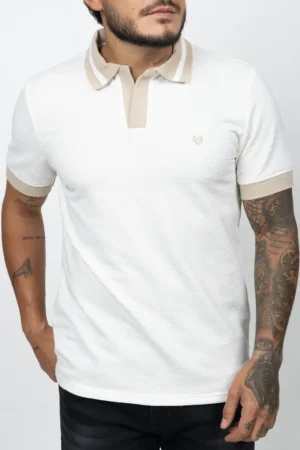 • Manga corta, cuello puños y perilla tejidos, perilla corta sin botones y aberturas en los costados.